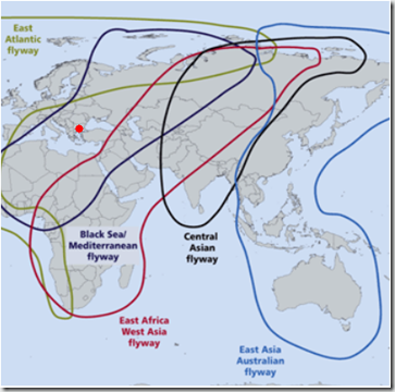 Bulgaria (red dot in map below) lies almost centered in the NE/SW oriented Black Sea / Mediterranean Flyway, which runs from northern Russia to western and central Africa. This flyway crosses south central Europe where H5N8 has recently emerged, and across the Middle East and Nigeria – both regions having reported H5N1 recently, and on numerous occasions in the past.