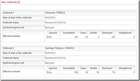 Following the notification by the owners of an increase in sudden death in birds at two backyards located in the States of Oaxaca and of Puebla, animals showing clinical signs suggestive of avian influenza were identified in both outbreaks. The official veterinary services launched the necessary epidemiological investigation and the presence of highly pathogenic avian influenza virus subtype H7N3 was confirmed. Control measures implemented immediately are, among others: quarantine, movement restrictions, stamping out and sampling in the focal and perifocal areas. Both outbreaks were confirmed as positive for avian influenza on 9 March and later by determining the intravenous pathogenicity index. So far, no epidemiological link has been identified between them.