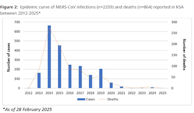 Reporting on MERS-CoV from Saudi Arabia (and neighboring countries) has plummeted over the past 6 years (see chart below), although the reasons why are a bit vague; The `fog' of the COVID pandemic, social distancing, and even some partial immunity from COVID vaccination has been suggested.